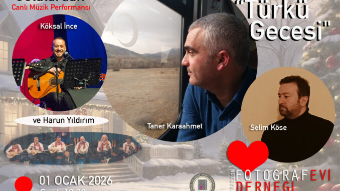 01 OCAK 2026 Perşembe 18.30′ da Trabzon Fotoğrafevi Derneğimizde “Türkü Gecesi” ile canlı müziklerde Taner Karaahmet, Selim Köse, Köksal İnce, Harun Yıldırım bizlerle birlikte olacaktır. ❤️YENİ YILIN❤️ ilk etkinliğinde bu efsane gecede birlikte olmaktan mutluluk duyacağız.